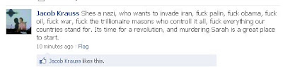 Sound ha, ha, funny? Not if you read the info and wall comments. I certainly hope that the Facebook community reports and flags this page enough to pull it. Facebook itself would do well to avoid any kind of liability or reputation issues by shutting it down quickly. Copycat pages are already popping up like here and here. They should all be eradicated, along with any other FB pages that suggest any person be used in that manner, not just Governor Palin.